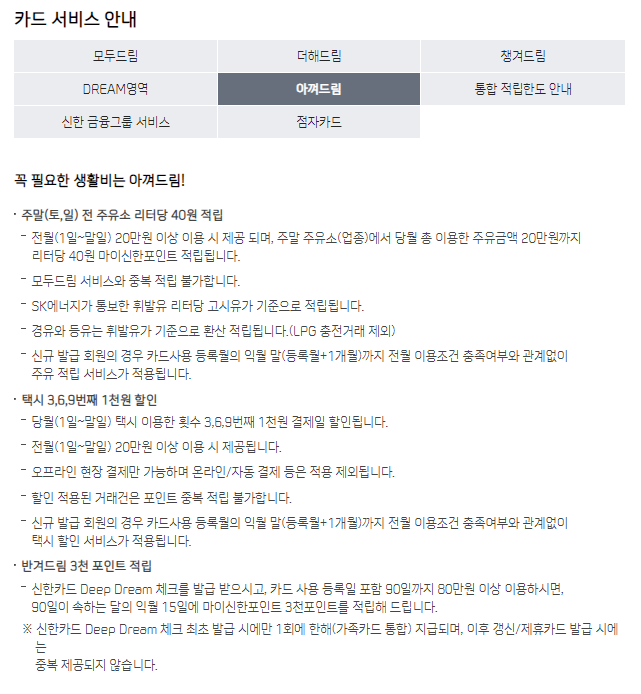 | 기본 : 신한 딥 드림 체크 카드 - 연회비 없다. 전월 실적 없다. |