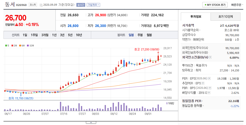 최근 동서 주식이 연일 강세 이다.