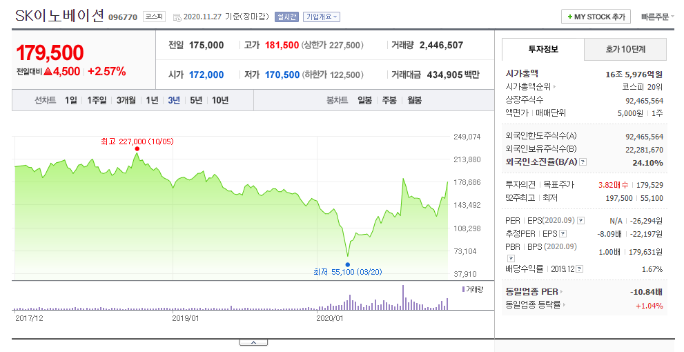 SK이노베이션 주식도 최근에 베터리 관련하여 많이 상승 하였다.