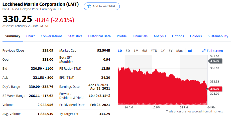 방산 분야에서 경쟁 업체인 록히드 마틴 주가도 지속적으로 약세 이다.