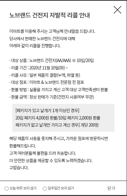 이마트 홈페이지 접속 하였는데 노브랜드 건전지 리콜 한다고 한다.