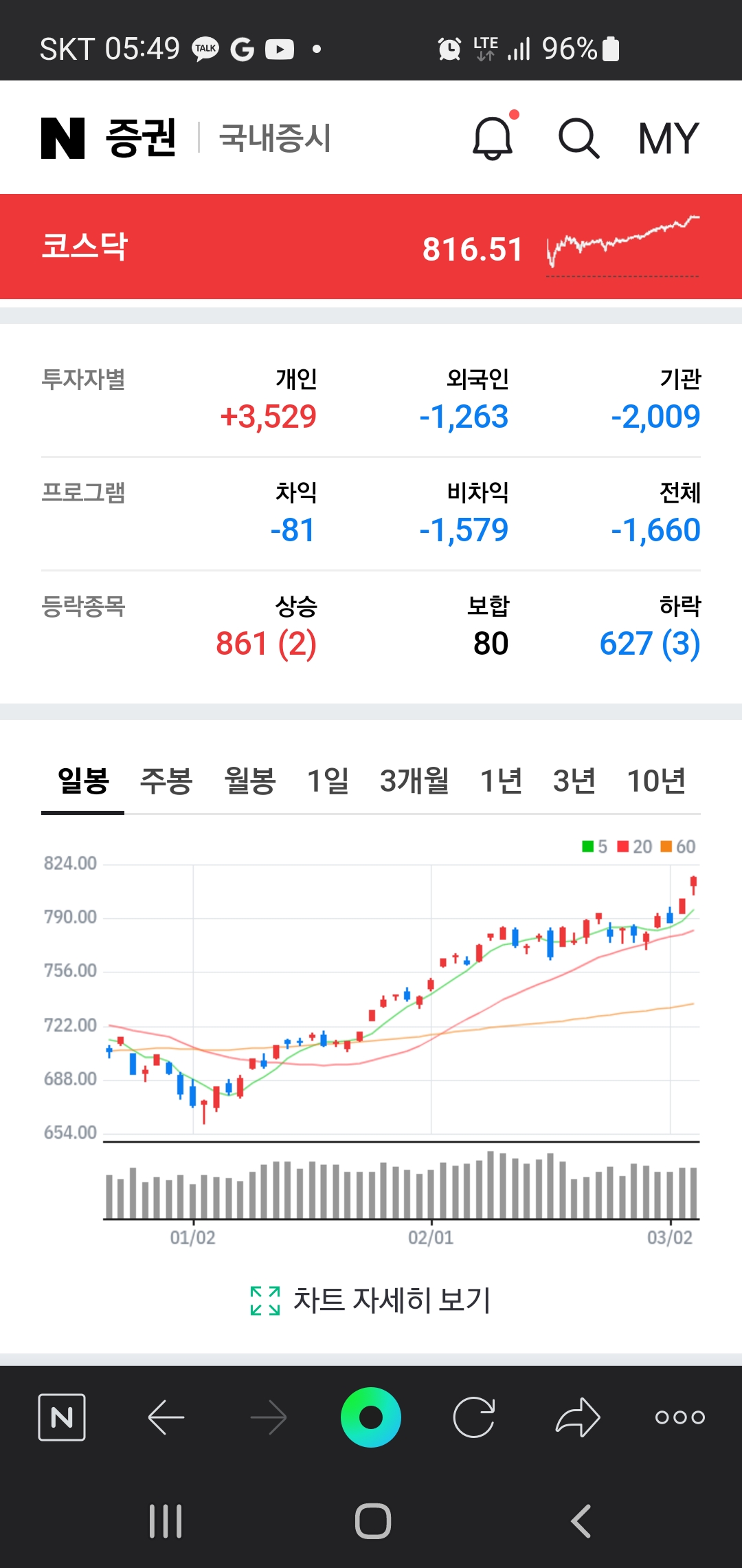 코스닥 지수가 816을 돌파 하였다.