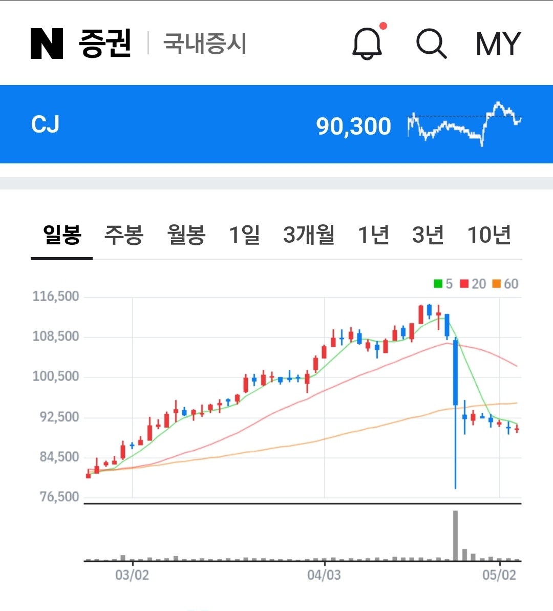 결과적으로는 CJ주식이 7만원대 거의 하한가를 터치 하였다가 오면서 다시 1년 이상 상승분을 모조리 반납하고 8만원 9만원에서 놀고 있다.