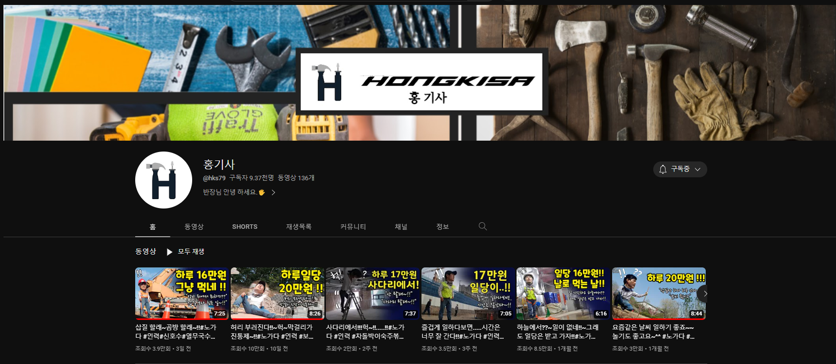 반장님 안녕 하세요.🖐️ 일상영상을 만들고 있는 홍기사입니다. 회사에서 시설관리 일하면서 수리영상 만들고~ 주말에는 애들 학원비,대출금에 조금이나마 도움이 되고자~ 토,일요일에만 건