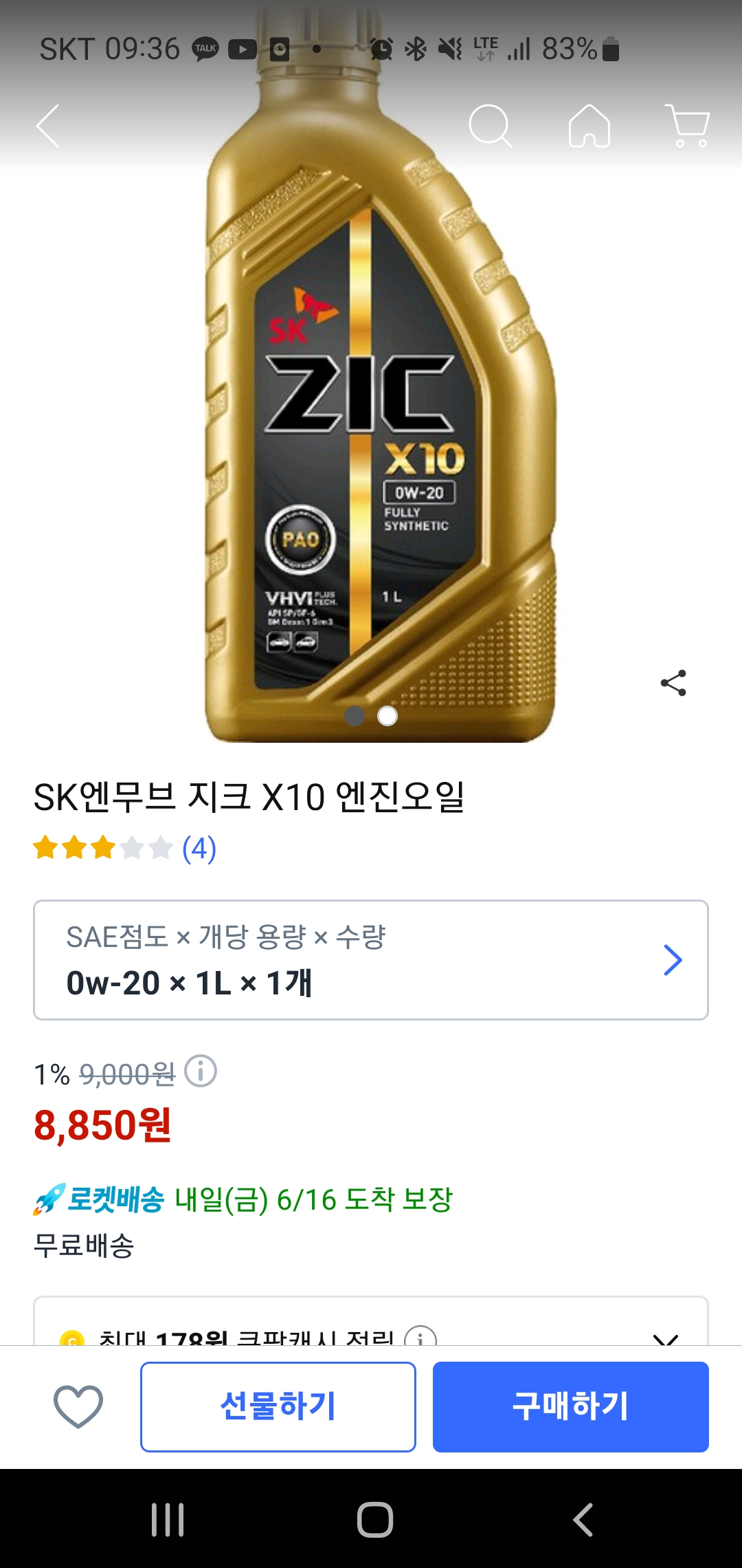 지크 엔진오일을 쿠팡에서 판매 한다 .