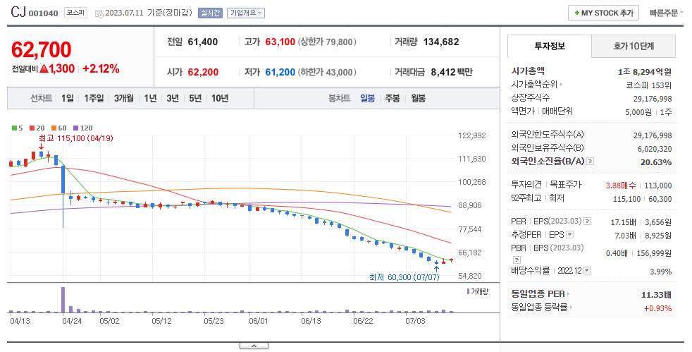 한국과 전세계 식탁을 지배 하고 있는 CJ 라는 기업의 주식이라고 믿어 지지는 않는다.