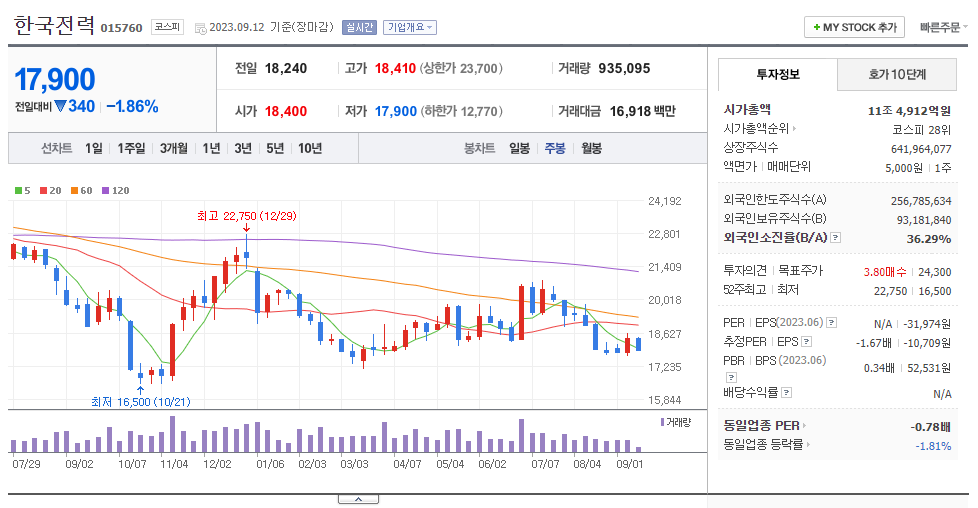 한국전력 주식 가격이 요동 치고 있다.