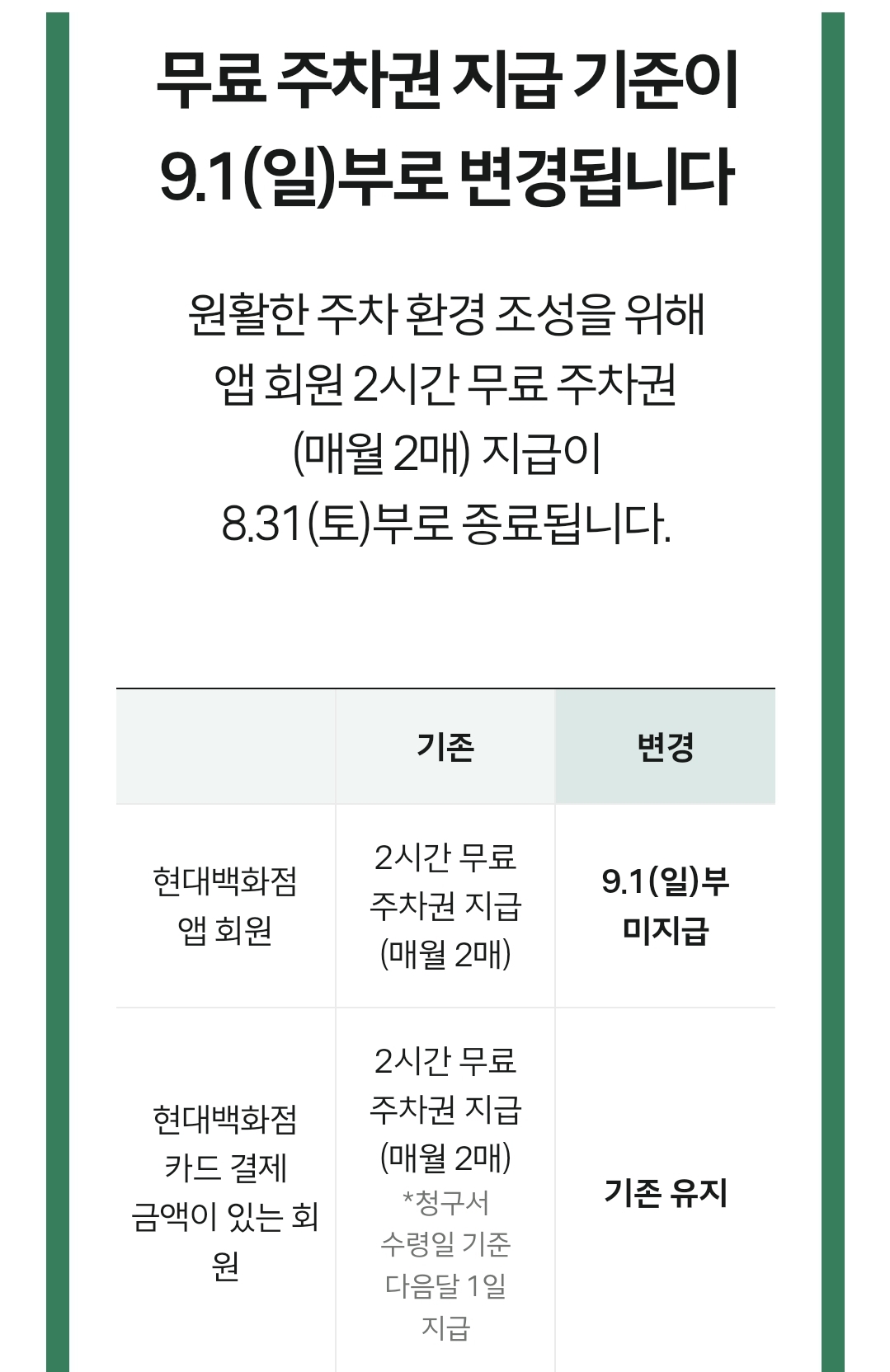 현대백화점 APP 같은거 설치 하면 무료 주차 쿠폰 월 2회 정도 뿌리는게 있있던거 같은데 , 2024.09 부터는 현대백화점 카드 실적 있는 고객만 무료 주차권을 준다고 한다.