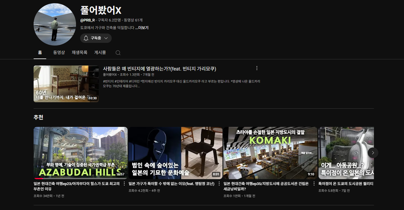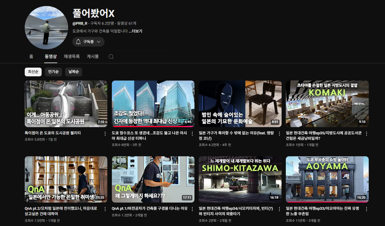 일본 건축 관련 영상을 많이 올려 주신다.