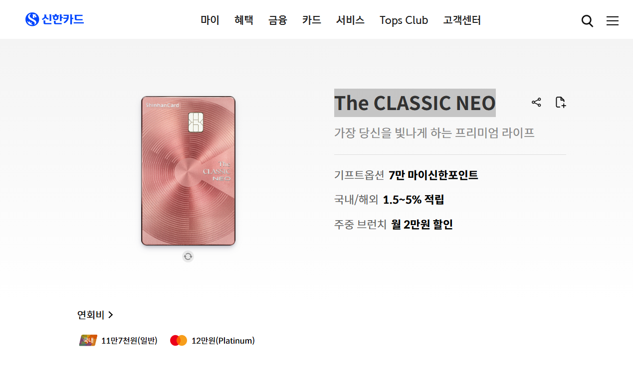 신한카드에서 주력으로 밀고 있는 프리미엄 VIP 카드 라인업인 클래식 에서