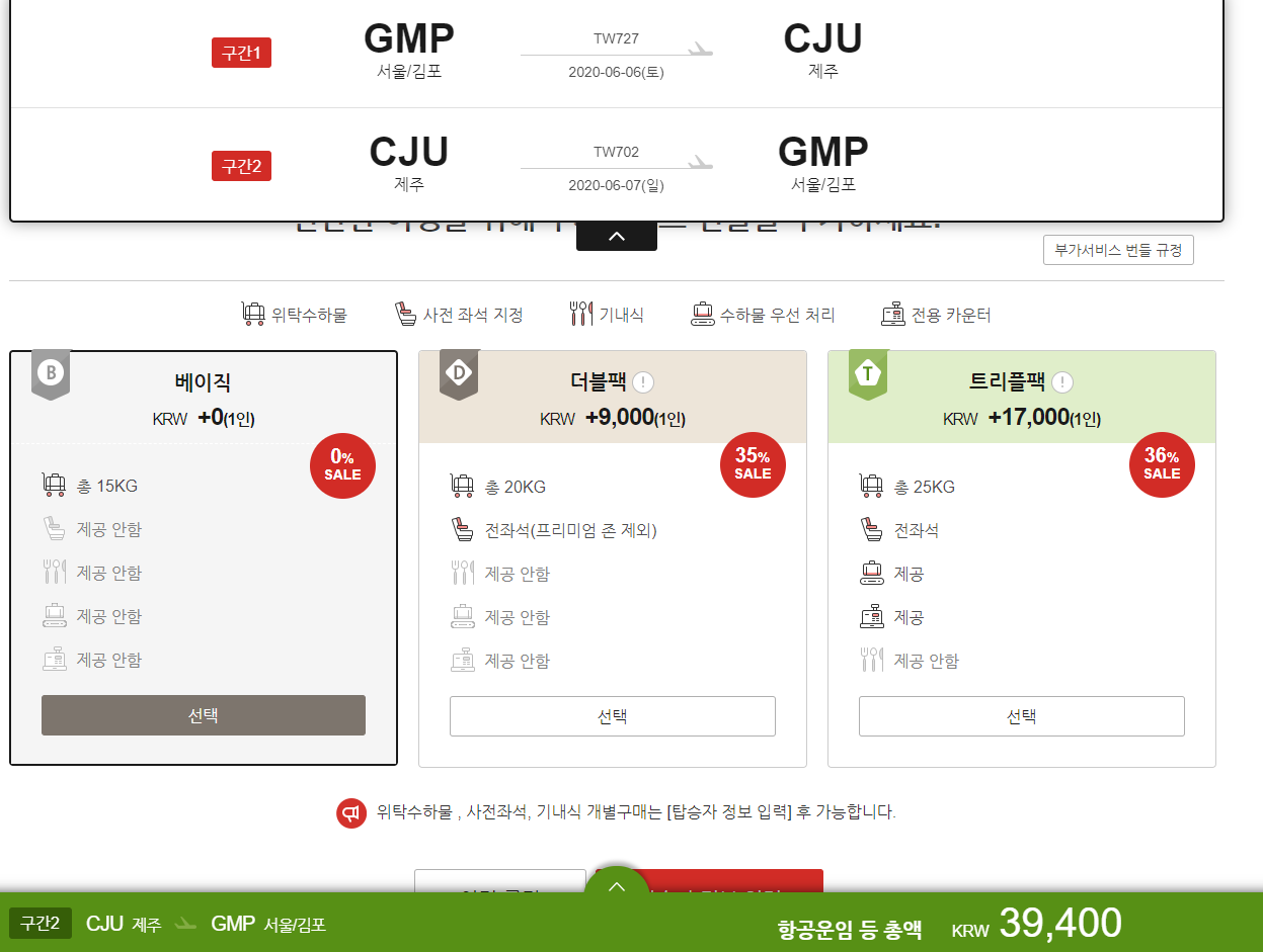 이번주는 그냥 대충 제주항공으로 조회 해서 39,400원