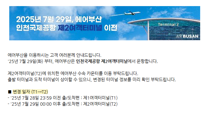 에어부산은 2025년 7월 29일 00시부터 인천국제공항 제2여객터미널(T2)로 이전하여 운항하고 있습니다.