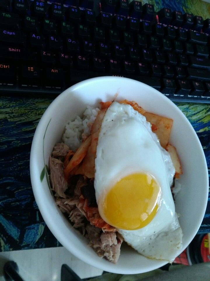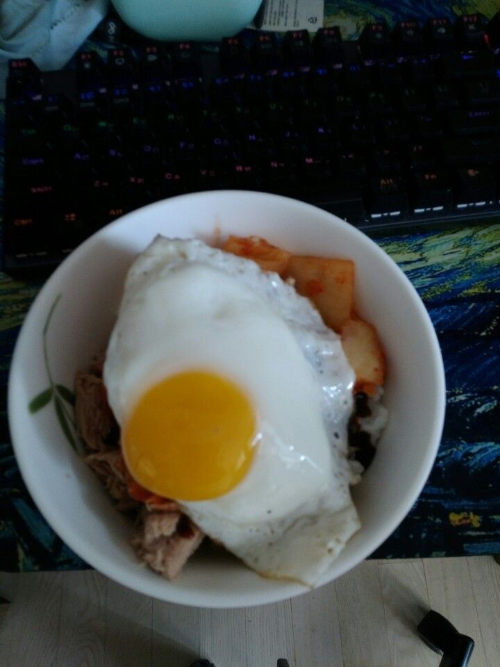 밥 + 계란 + 김치 + 참치 를 용기에 넣고 혼합시켜서 먹었습니다.