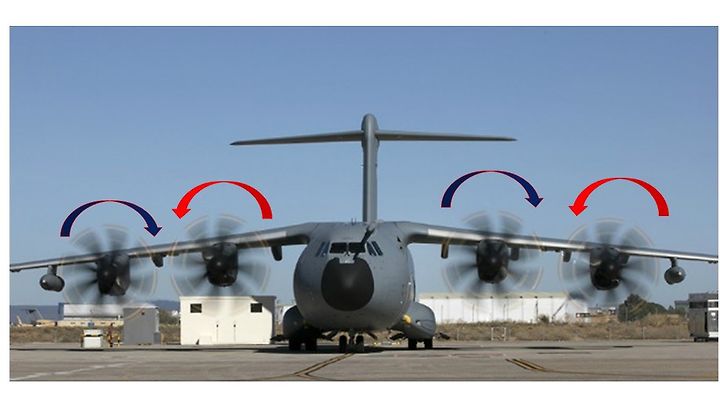 A400M 수송기의 특이한 사항중 하나가 프로펠러가 서로 교차로 반대로 회전 한다는것이다.